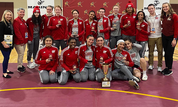 The Sacred Heart women’s wrestling won their first regional championship Saturday and are sending nine wrestlers to the NCWWC national championships in Iowa. (Photo courtesy Sacred Heart athletics)