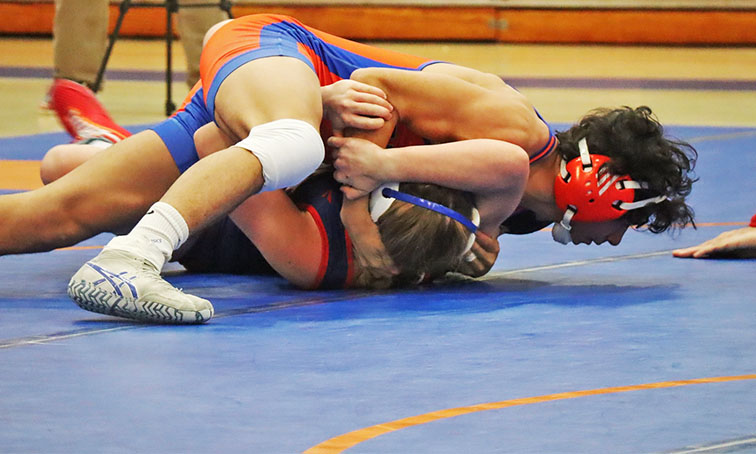 Danbury’s Victor Velez (138) works on a pin in Monday’s match with Mt. Anthony Union in Danbury. (Photo courtesy Danbury wrestling)