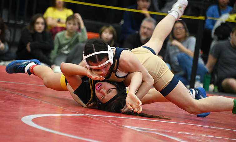 Platt’s Daylianette Sanchez Cardona had Jonathan Law’s Selena Batres on her back in the final at 100 pounds in the CIAC Girls Invitational Saturday. Batres rallied for a 5-4 victory.