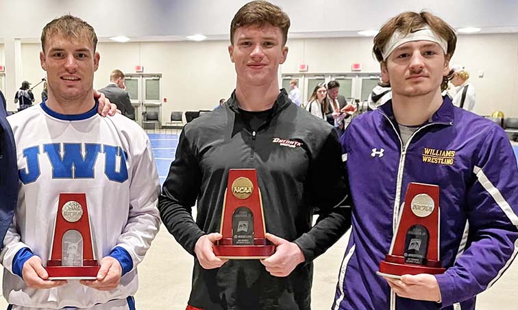 From left, Johnson & Wales Ryan DeVivo, Oneonta State’s Jack Ryan and Williams’ Peter Kane. (Photo courtesy Connecticut USA Wrestling)