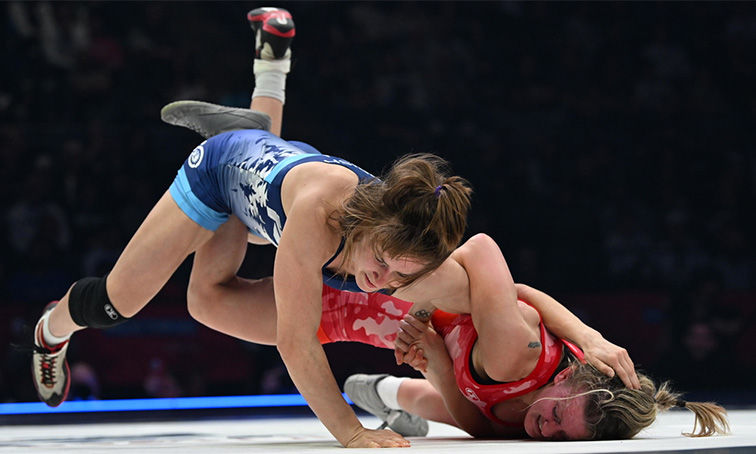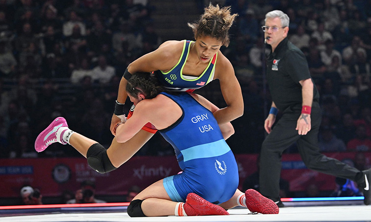 In the women’s freestyle, Kennedy Blades (76 kg) earned her first berth on the U.S. Olympic team with a victory over Adeline Gray, a six-time world champion and a silver medalist at the 2021 Olympics in Toyko.