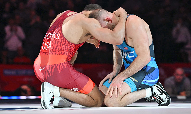 In March, Brooks won his fourth NCAA championship. This weekend, he had a pair of come-from-behind victories to earn a spot in the best-of-3 championship final against Taylor, a former Penn State wrestler who won a gold medal in Tokyo in 2021 and three world championships.