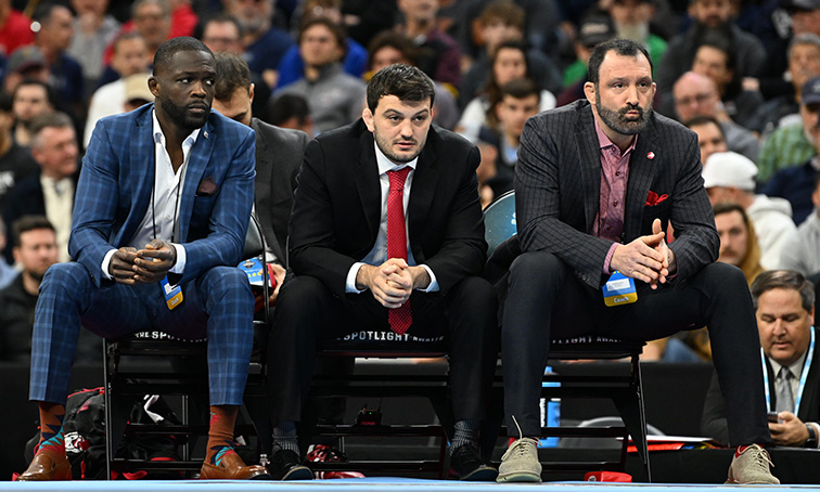 Danbury High graduate Kevin Jack, center, is the new head coach at IMG Academy in Florida. Above, Jack at the 2025 NCAA championships with North Carolina State between Zack Esposito, left, and head coach Pat Popolizio, right. (Photo courtesy Sam Janicki / SJanickiPhoto.com)