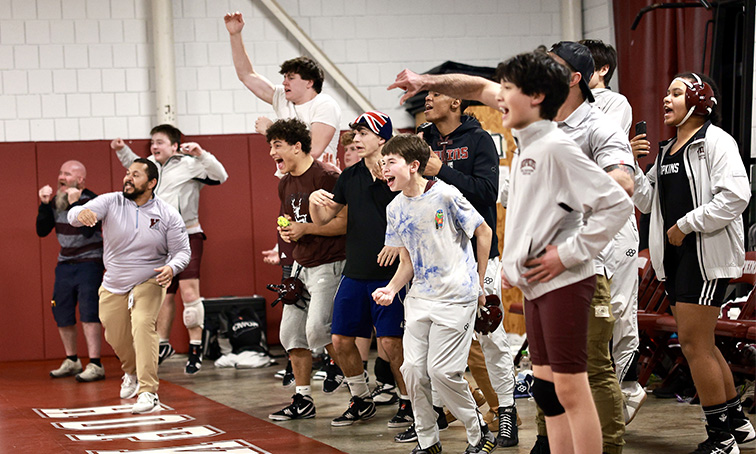 Wrestlers and staff at Hopkins School in New Haven celebrate a win in Wednesday’s dual meet in New Haven. Hopkins won two of three in a quad-match with Choate Rosemary Hall, Greenwich Country Day and Hamden Hall Day. (Photo courtesy Leigh Busby)