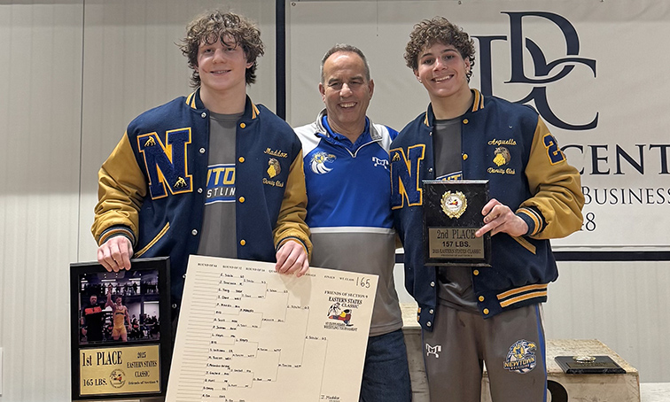 Newtown’s Jake Maddox, left and Antonio Arguello, right each advanced to the final at Saturday’s Eastern States Classic tournament in New York. Newtown coach Chris Bray is in the middle. (Photo courtesy Newtown High wrestling)